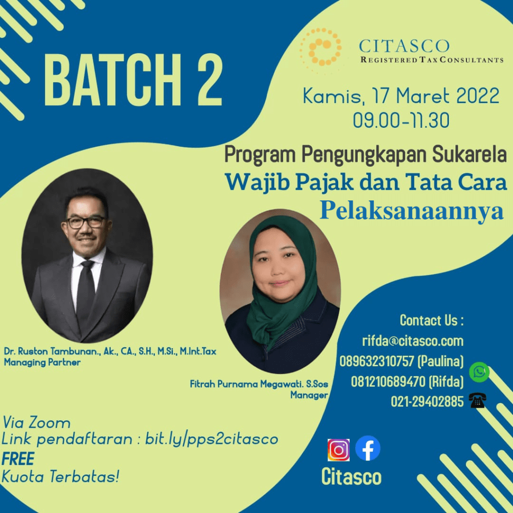 Webinar Program Pengungkapan Sukarela Wajib Pajak dan Tata Cara Pelaksanaannya (via zoom) Hari, Tanggal : Kamis, 17 Februari 2022 Jam : 09.00 – 11.00 WIB Narasumber : 1. Dr. Ruston Tambunan, Ak., CA., S.H., M.Si., M.Int.Tax 2. Fitrah Purnama Megawati, S.Sos FREE Link Pendaftaran =